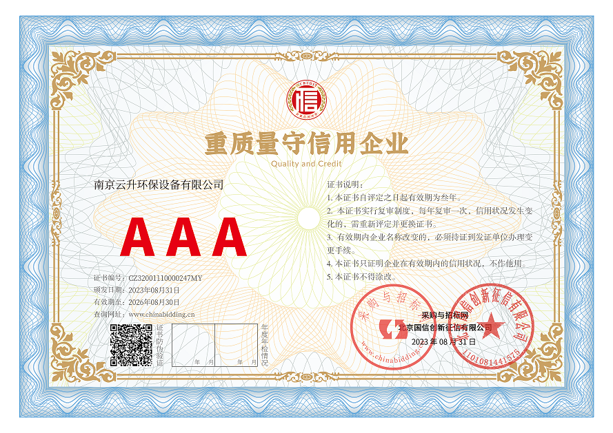 南京云升環保設備有限公司全體員工愿以環境保護為己任,以市場為導向,以優質服務為原則,嚴格的管理、先進的生產工藝、至上的品質、完善的售前售后服務,與廣大新老用戶攜手并進,共鑄輝煌。公司已通過ISO9001:2000質量管理體系標準認證,成為江蘇省高新企業,并進行不斷的技術改進和創新,為客戶和合作伙伴提供滿意的產品。